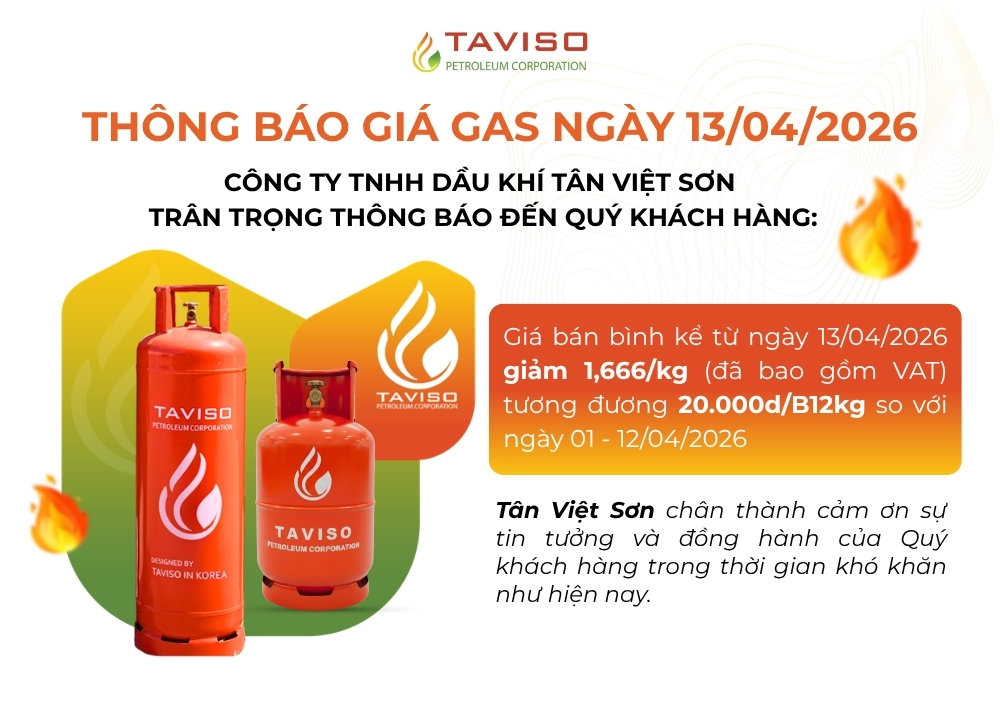 01 Th4 Thông tin về gas, Tin Tức Thông Báo Điều Chỉnh Giá Gas Tháng 04/2026 Posted by tanvietson 9 Tháng 4, 2026 Nhằm giúp Quý khách hàng và các đối tác chủ động trong kế hoạch vận hành kinh doanh, Công ty TNHH Dầu khí Tân Việt Sơn (TAVISO) xin gửi... Continue reading