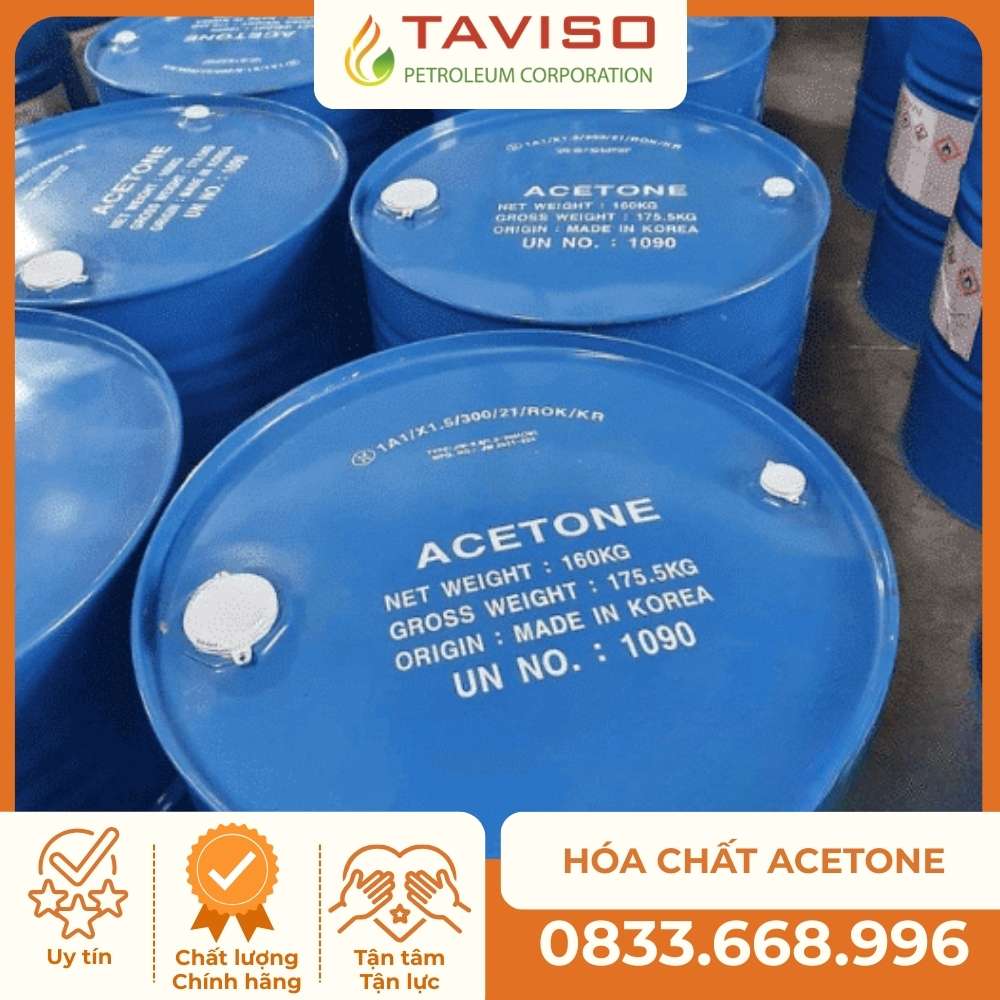 Acetone (hay Axeton) là hợp chất hữu cơ có công thức C3H6O, tồn tại dưới dạng chất lỏng trong suốt, không màu và có mùi đặc trưng. Đây là loại dung môi phổ biến nhất trong họ Xeton nhờ khả năng hòa tan tốt trong nước và hầu hết các loại dung môi hữu cơ khác. Hiện nay, Tân Việt Sơn cung cấp sản phẩm Acetone nhập khẩu trực tiếp từ Thái Lan và Đài Loan với quy cách đóng phuy 160kg, đảm bảo độ tinh khiết cao nhất cho các nhu cầu sản xuất công nghiệp và thí nghiệm.